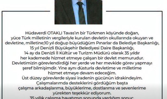 DENİZLİ (İHA) – Denizli İl Kültür ve Turizm Müdürlüğü görevinden alınan Hüdaverdi Otaklı, sosyal medya hesabından imalı bir veda mesajı yayımladı. Görevde ayrılış şekline sitem eden Otaklı, "Vefa, İstanbul'da sadece bir semtin adıymış" ifadesini kullandı.
