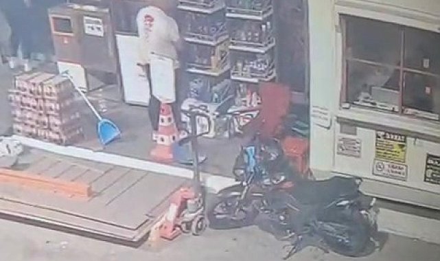 Denizli'de rahat ve umursamaz tavırları ile çalışanın yanı başında hırsızlık yapan grup güvenlik kamerasına yansıdı. Stanttan aldıkları madeni yağı araçlarına boşaltıp, etrafta arama yaptılar.