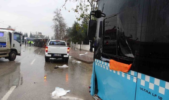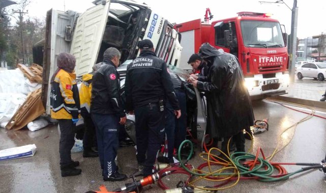 Antalya'da gübre yüklü kamyon kavşakta bir otomobili önüne alıp metrelerce sürükledikten sonra park halindeki belediye otobüsüne çarpıp devrildi. Kazada kamyonun altına kalan otomobilde sıkışan kadın sürücü, itfaiye ekipleri tarafından kurtarılarak sağlık ekiplerine teslim edildi.