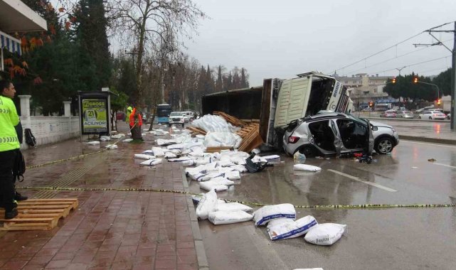 Gübre yüklü kamyon çarpıştığı otomobili metrelerce sürükleyip üzerine devrildi