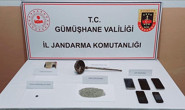 Gümüşhane'de jandarma ekipleri tarafından yapılan operasyonda tarihi eser niteliğinde üstü işlemeli metal kepçe, Roma dönemine ait sikke ve ham altın cevheri ele geçirildi.