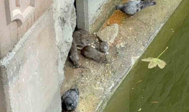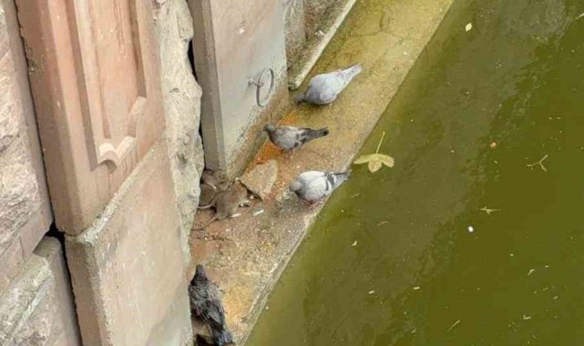 Eskişehir'de güvercinlerin ve farelerin Porsuk Çayı'nın kenarında birlikte yemek yediği ilginç anlar cep telefonu kamerasına yansıdı.