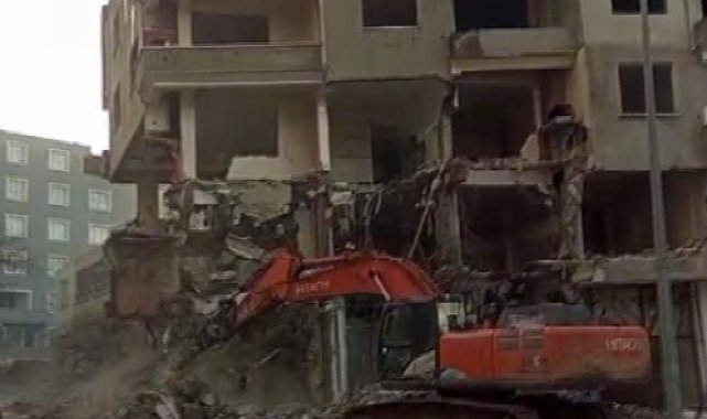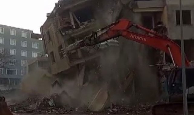 Hatay'da hasarlı 5 katlı bina iş makinesinin darbesiyle yerle bir oldu