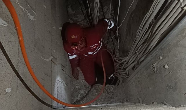 Havalandırma boşluğuna düşen kedinin itfaiye tarafından kurtarıldığı anlar kamerada