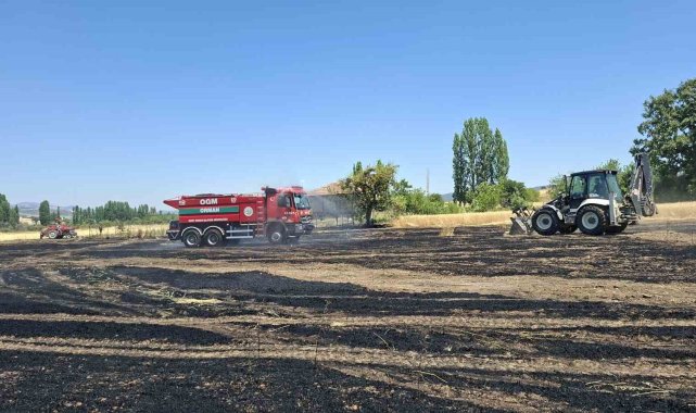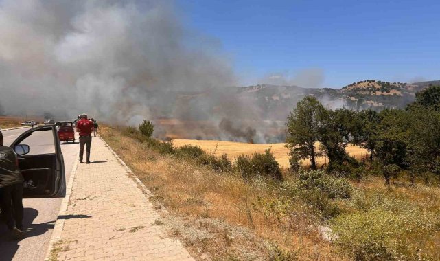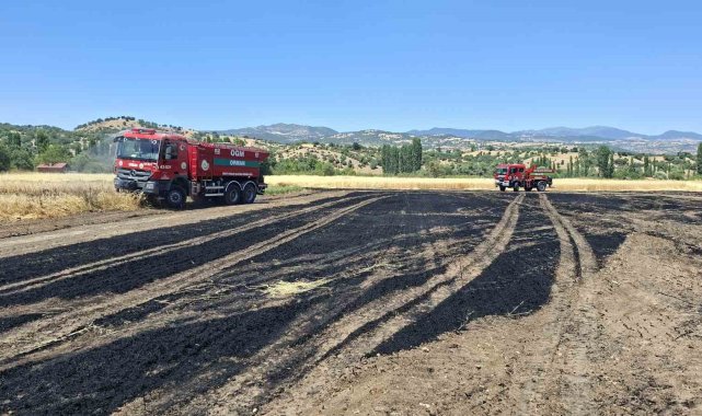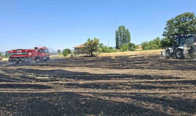 Kütahya'nın Hisarcık ilçesinde biçerdöverden çıkan kıvılcımın hububat ekili alanı tutuşturması sonucu çıkan yangında 2,5 dekar buğday ekili alan zarar gördü.