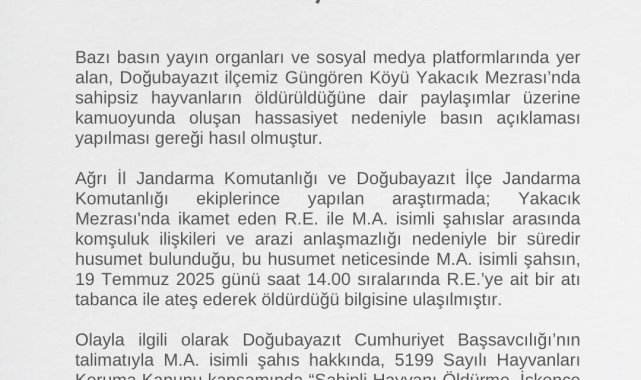 Ağrı'nın Doğubayazıt ilçesine bağlı Güngören köyünde bir şahıs, aralarında arazi anlaşamazlığı bulunan husumetlisinin atını tabancayla vurarak öldürdü.Doğubayazıt Kaymakamlığından yapılan açıklamada, bazı basın yayın organları ve sosyal medya platformlarında, sahipsiz hayvanların öldürüldüğüne dair çıkan haberler üzerine kamuoyunda oluşan hassasiyet nedeniyle açıklama yapılması gerektiği bildirildi. Açıklamada, "Yakacık Mezrası'nda ikamet eden R.E. ile M.A. isimli şahıslar arasında komşuluk ilişkileri ve arazi anlaşmazlığı nedeniyle bir süredir husumet bulunduğu, bu husumet neticesinde M.A. isimli şahsın, 19 Temmuz 2025 günü saat 14.00 sıralarında R.E.'ye ait bir atı tabanca ile ateş ederek öldürdüğü bilgisine ulaşılmıştır" denildi.Olayın ardından Doğubayazıt Cumhuriyet Başsavcılığı koordinesinde başlatılan soruşturma kapsamında, M.A. hakkında 5199 Sayılı Hayvanları Koruma Kanunu uyarınca "Sahipli Hayvanı Öldürme, İşkence ve Kötü Muamele" suçlarından adli işlem başlatıldığı kaydedildi.