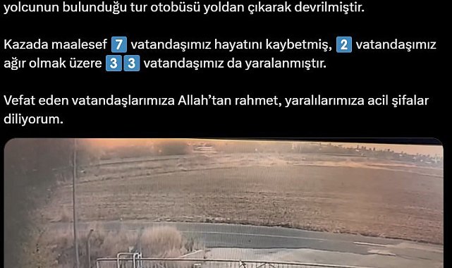 İçişleri Bakanı Ali Yerlikaya: "Kazada maalesef 7 vatandaşımız hayatını kaybetmiş, 2 vatandaşımız ağır olmak üzere 33 vatandaşımız da yaralanmıştır"