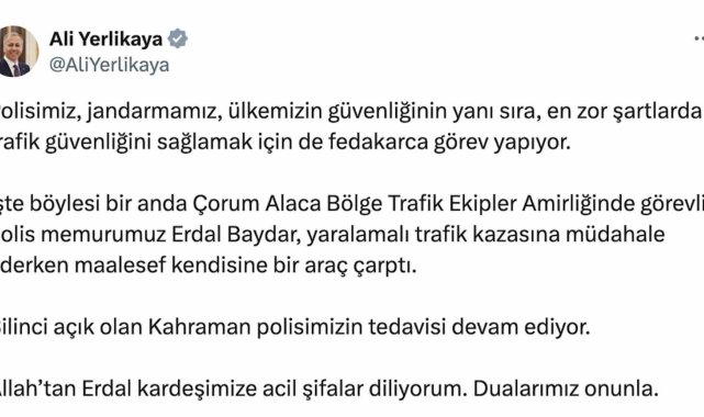 İçişleri Bakanı Ali Yerlikaya, Çorum'da kazaya müdahale ederken kamyonun çarpması sonucu yaralanan polis memuruna 'geçmiş olsun' dileklerini iletti.