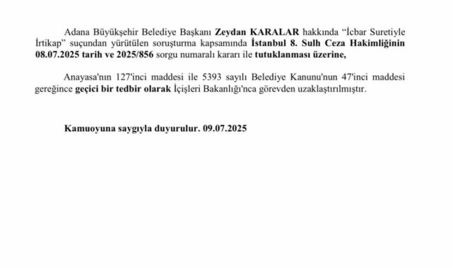 İçişleri Bakanlığı, Adana Büyükşehir Belediye Başkanı ve Büyükçekmece Belediye Başkan Vekilinin görevden uzaklaştırılmasına ilişkin basın açıklamasında bulundu.İçişleri Bakanlığı, Adana Büyükşehir Belediye Başkanı Zeydan Karalar'ın 'İcbar Suretiyle İrtikap' suçundan yürütülen soruşturma kapsamında İstanbul 8. Sulh Ceza Hakimliğinin kararı ile tutuklanması üzerine İçişleri Bakanlığınca geçici olarak görevden uzaklaştırıldı. Büyükçekmece Belediye Başkan Vekili Ahmet Şahin ise 'Suç İşlemek Amacıyla Örgüte Üye Olma ve Rüşvet Almak' suçundan yürütülen soruşturma kapsamında İstanbul 4. Sulh Ceza Hakimliğinin kararı ile tutuklanması üzerine İçişleri Bakanlığınca geçici olarak görevden uzaklaştırıldı.