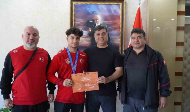 Manisa Gençlik ve Spor İl Müdürü Yunus Öztürk, Romanya'da düzenlenen U20 Grekoromen Güreş Balkan Şampiyonası'nda 63 kilo kategorisinde bronz madalya kazanan milli sporcu Kadir Kadıroğlu'nu makamında ağırlayarak tebrik etti.