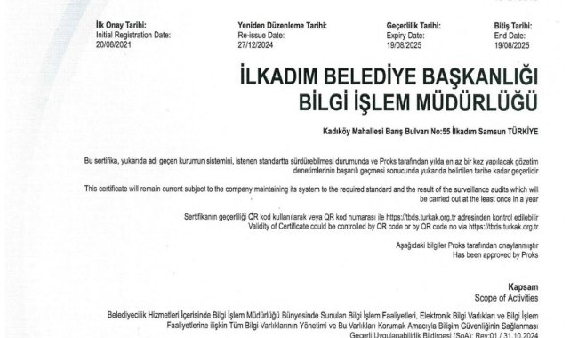 Samsun İlkadım Belediyesi Bilgi İşlem Müdürlüğü, ISO/IEC 27001:2022v Bilgi Güvenliği Yönetim Sistemi (BGYS) belgesini güncelleyerek bilgi güvenliği konusunda uluslararası standartlara uygunluğunu bir kez daha kanıtladı.