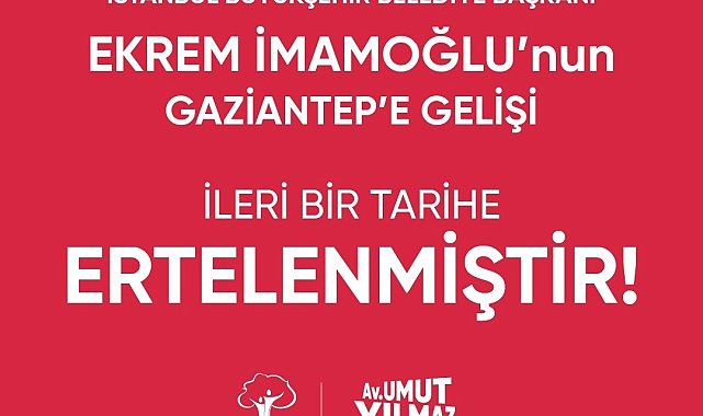 Türkiye Belediyeler Birliği (TBB) ve İstanbul Büyükşehir Belediye Başkanı Ekrem İmamoğlu'nun 17 Ocak Cuma günü Gaziantep'e gerçekleştireceği program ileri bir tarihe ertelendi.Türkiye Belediyeler Birliği (TBB) ve İstanbul Büyükşehir Belediye Başkanı Ekrem İmamoğlu'nun 17 Ocak 2025 Cuma günü gerçekleştireceği Gaziantep ziyareti ertelendi. İmamoğlu ileri bir tarihte Gaziantep'e gelecek. Şehitkamil Belediye Başkanı Umut Yılmaz, sosyal medya hesabından yaptığı duyuruda program belli olduğunda yeniden bilgilendirme yapılacağını belirterek, "Türkiye Belediyeler Birliği ve İstanbul Büyükşehir Belediye Başkanımız Sayın Ekrem İmamoğlu'nun Gaziantep programı ileri bir tarihe ertelenmiştir. Programı belli olduğunda yeniden bilgilendirme yapılacaktır" dedi.