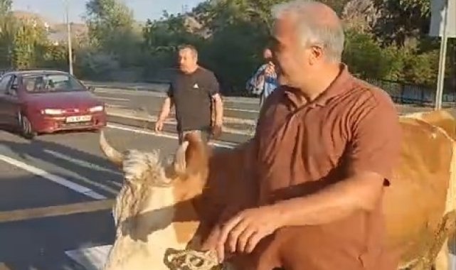 Gümüşhane'nin merkeze bağlı Tekke beldesinde bir vatandaş, büyükbaş hayvanlarını trafiğin işlek olduğu Gümüşhane-Bayburt karayolunda yaya geçidinden karşıya geçirmek zorunda kaldı.