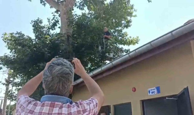Tekirdağ'ın Çorlu ilçesinde ayağına ip dolanarak ağaca asılı kalan karga, itfaiye ekiplerinin müdahalesiyle kurtarıldı. Vatandaşlar film izler gibi operasyonu takip etti.