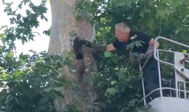 İple ağaçta asılı kalan karga kurtarıldı