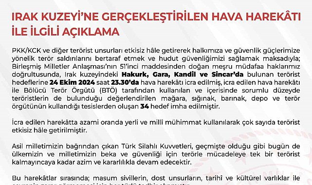 Milli Savunma Bakanlığı (MSB) Irak'ın kuzeyindeki Hakurk, Gara, Kandil ve Sincar'da bulunan terörist hedeflerine 24 Ekim saat 23.30'da hava harekatı düzenlendiğini ve içerisinde sorumlu düzeyde teröristlerin de bulunduğu değerlendirilen mağara, sığınak, barınak, depo ve terör örgütünün kullandığı tesislerden oluşan 34 hedefin imha edildiğini açıkladı.Milli Savunma Bakanlığından yapılan açıklamada, "PKK/KCK ve diğer terörist unsurları etkisiz hale getirerek halkımıza ve güvenlik güçlerimize yönelik terör saldırılarını bertaraf etmek ve hudut güvenliğimizi sağlamak maksadıyla; Birleşmiş Milletler Anlaşması'nın 51'inci maddesinden doğan meşru müdafaa haklarımız doğrultusunda, Irak kuzeyindeki Hakurk, Gara, Kandil ve Sincar'da bulunan terörist hedeflerine 24 Ekim 2024 saat 23.30'da hava harekatı icra edilmiş, icra edilen hava harekatı ile Bölücü Terör Örgütü (BTÖ) tarafından kullanılan ve içerisinde sorumlu düzeyde teröristlerin de bulunduğu değerlendirilen mağara, sığınak, barınak, depo ve terör örgütünün kullandığı tesislerden oluşan 34 hedef imha edilmiştir" ifadelerine yer verildi. Terörle mücadelede kararlılık vurgusu yapılan açıklamada, "İcra edilen harekatta azami oranda yerli ve milli mühimmat kullanılarak çok sayıda terörist etkisiz hale getirilmiştir. Asil milletimizin bağrından çıkan Türk Silahlı Kuvvetleri, geçmişte olduğu gibi bugün de ülkemizin ve milletimizin beka ve güvenliği için terörle mücadeleye tek bir terörist kalmayıncaya kadar azim ve kararlılıkla devam edecektir. Bu harekatlar sırasında; masum sivillerin, dost unsurların, tarihî ve kültürel varlıklar ile çevrenin zarar görmemesi için her türlü tedbir alınmıştır" denildi.