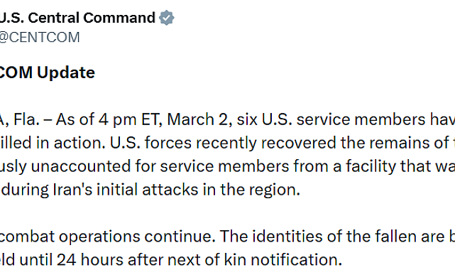 ABD Merkez Komutanlığı (CENTCOM), Cumartesi gününden bu yana İran'a karşı yürütülen operasyon sırasında ölen ABD askerlerinin sayısının 6'ya yükseldiğini açıkladı.
