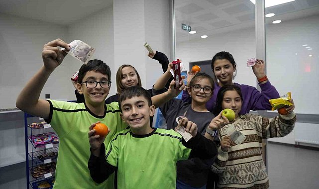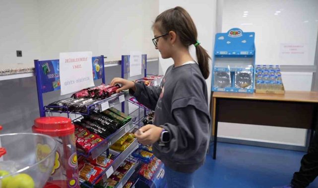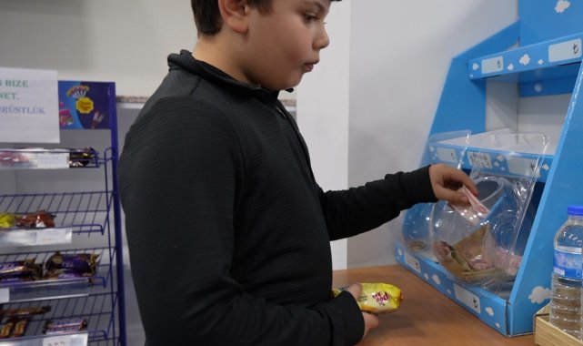 İşletmecisi olmayan okul kantininde öğrenciler alışveriş yaparken güven ve dürüstlük kavramlarını öğreniyor