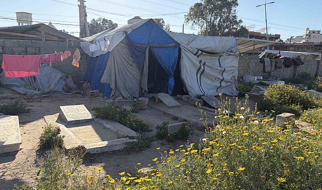 İsrail saldırıları sonrası yerinden edilen Gazzeli Halid ez-Zaanin, barınacak yer bulamayınca ailesiyle birlikte mezarlığa sığınmak zorunda kaldı.