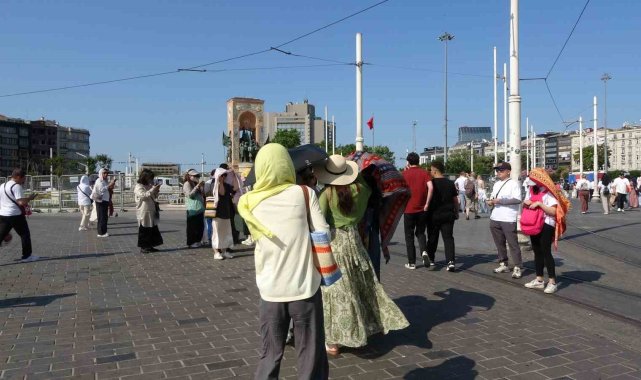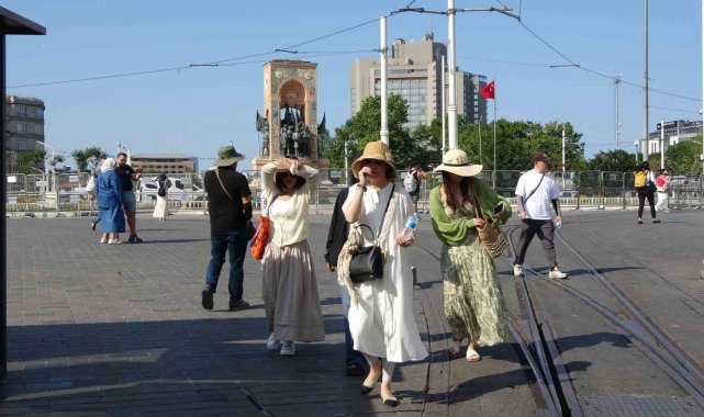 İstanbul'da etkili olan yüksek sıcaklık vatandaşlara zor anlar yaşattı. Taksim Meydanı'nda bazı yerli ve yabancı turistler gölge alanlarda serinlerken, bazıları da şemsiye ile gezdi.