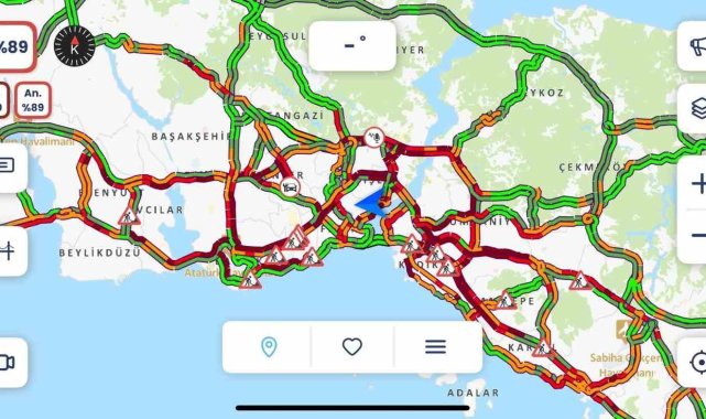 İstanbul'da trafik yoğunluğu, haftanın son iş gününde ve mesai saatinin bitimiyle birlikte yüzde 90'a yaklaştı. Megakent'te gün boyu belirli aralıklarla etkili olan yağmur ,akşam saatlerinde de etkili olunca ana arterlerde trafikte aksamalara neden oldu. Beyoğlu Halıcıoğlu'nda Anadolu ve Avrupa yakalarında trafik ara ara durma noktasına geldi. İstanbul Büyükşehir Belediyesi (İBB) cep trafik verilerine göre saat 18.50 itibariyle yüzde 89 olarak ölçüldü.