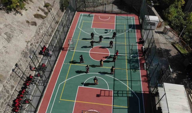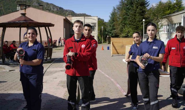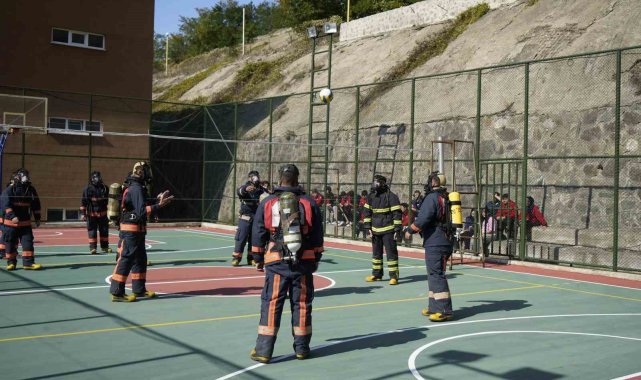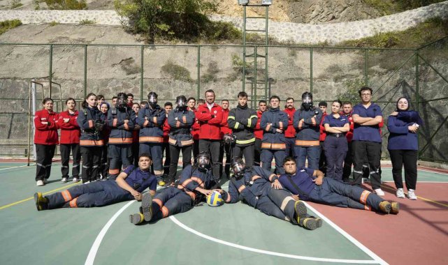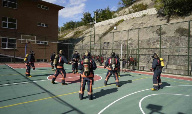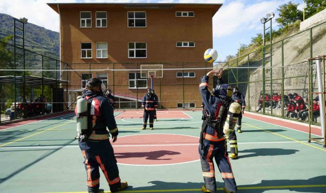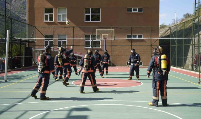 Gümüşhane'de itfaiyecilik programı öğrencileri, yangınlara hazırlık kapsamında 20 kilogramlık itfaiyeci kıyafetleriyle voleybol oynayarak hem eğleniyor hem de eğitim yapıyor.