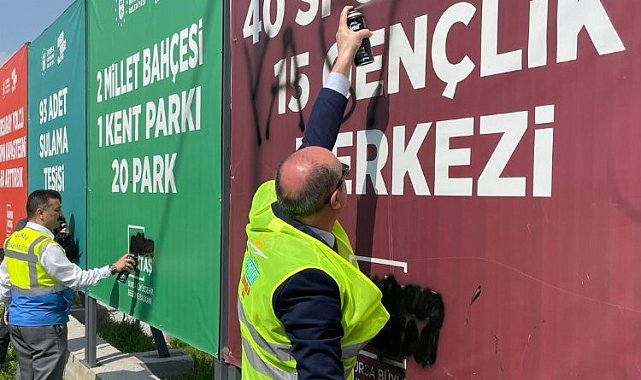 Gördük ki, söz konusu iktidar partisi olunca devlet yetkilileri kılını dahi kıpırdatmıyor. Valilik sus pus, Kaymakamlıktan adeta çıt çıkmıyor. Bu durumda iş başa düştü" diyerek ellerine aldıkları sprey boyalarla ile Büyükşehir logolu afişleri kapattılar.