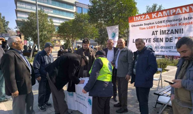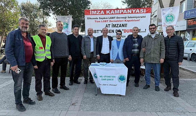 İzmir'de toplanan Manevi İlkeli Liyakatli Diyanet ve Vakıf Çalışmaları Sendikası (Mil-Diyanet Sen) üyeleri, LGBT derneklerinin kapatılması için imza kampanyası başlattı.