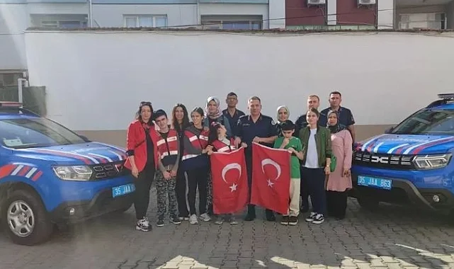 İzmir'in Ödemiş ilçesinde eğitim özel gereksinimli öğrenciler, bir günlüğüne askerlik heyecanı yaşadı.İZMİR (İGFA) - İzmir'in Ödemiş ilçesinde Şehit Yasin Naci Ağaroğlu İmam Hatip Ortaokulunda eğitim gören ve asker olmak isteyen özel gereksinimli 4 öğrenci, Dünya Astsubaylar Günü etkinlikleri kapsamında jandarma araçlarıyla okuldan alınıp İlçe Jandarma Komutanlığına getirildi.İçişleri Bakanlığı'nın resmi internet sitesinde yer alan habere göre Jandarma yeleği giydirilen öğrencilere karakol gezdirildi, askerlik hakkında bilgi verildi.Öğrencilerden Emine Gök, Türk bayrağını öperek İlçe Jandarma Komutanı Binbaşı Cihan Gültekin'e verdi.Bayrağı öperek teslim alan Gültekin de öğrenciler için hazırlanan terhis belgesini takdim etti.