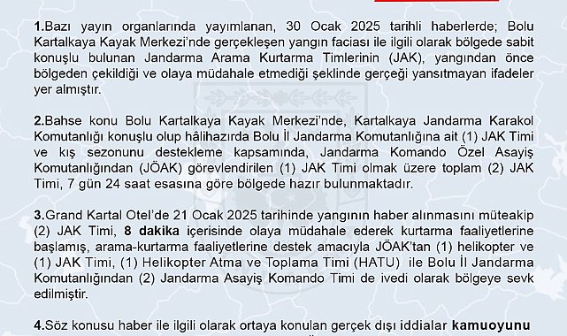 Jandarma Genel Komutanlığı, Bolu Kartalkaya Kayak Merkezi'nde otelde meydana gelen yangına Jandarma Arama Kurtarma (JAK) timlerinin müdahale etmediği iddialarının gerçeği yansıtmadığını açıkladı.Konuyla ilgili Jandarma Genel Komutanlığından yapılan açıklamada, "Bazı yayın organlarında yayımlanan 30 Ocak 2025 tarihli haberlerde Bolu Kartalkaya Kayak Merkezi'nde gerçekleşen yangın faciası ile ilgili olarak bölgede sabit konuşlu bulunan Jandarma Arama Kurtarma Timlerinin (JAK) yangından önce bölgeden çekildiği ve olaya müdahale etmediği şeklinde gerçeği yansıtmayan ifadeler yer almıştır. Bahse konu Bolu Kartalkaya Kayak Merkezi'nde Kartalkaya Jandarma Karakol Komutanlığı konuşlu olup, halihazırda Bolu İl Jandarma Komutanlığına ait bir JAK Timi ve kış sezonunu destekleme kapsamında Jandarma Komando Özel Asayiş Komutanlığından (JÖAK) görevlendirilen bir JAK Timi olmak üzere toplam iki JAK Timi, 7 gün 24 saat esasına göre bölgede hazır bulunmaktadır. Grand Kartal Otel'de 21 Ocak 2025 tarihinde yangının haber alınmasını müteakip iki JAK Timi, 8 dakika içerisinde olaya müdahale ederek kurtarma faaliyetlerine başlamış, arama-kurtarma faaliyetlerine destek amacıyla JÖAK'tan bir helikopter ve bir JAK Timi, bir Helikopter Atma ve Toplama Timi (HATU) ile Bolu İl Jandarma Komutanlığından iki Jandarma Asayiş Komando Timi de ivedi olarak bölgeye sevk edilmiştir. Söz konusu haberle ilgili olarak ortaya konulan gerçek dışı iddialar kamuoyunu yanıltmaya ve Jandarma Genel Komutanlığının itibarını olumsuz etkilemeye yöneliktir" ifadelerine yer verildi.