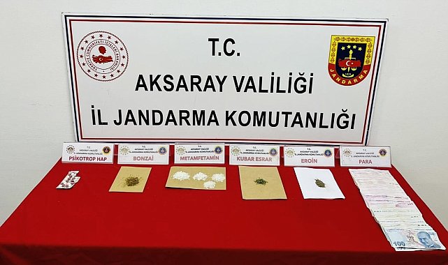 Aksaray'da uyuşturucu tacirlerine yönelik operasyon düzenleyen jandarma, uyuşturucularla birlikte 2 şüpheliyi yakalarken adli makamlara sevk edilen şahıslar tutuklanarak cezaevine gönderildi.Operasyon, Aksaray merkezde bir ikamete yönelik gerçekleştirildi. Edinilen bilgiye göre, uyuşturucuyla mücadele çerçevesinde çeşitli çalışmalar yapan İl Jandarma Komutanlığı Kaçakçılık ve Organize Suçlarla Mücadele (KOM) Şubesi ekipleri 2 şahsın uyuşturucu imal ve ticareti yaptığı bilgisine ulaştı. İstihbari bilgiler doğrultusunda Aksaray Cumhuriyet Başsavcılığı koordinesinde harekete geçen ekipler isim ve adreslerini tespit ettiği 2 şüpheliyi takibe aldı. Bir süre yapılan teknik ve fiziksel takibin ardından yeterli delile ulaşan jandarma ekipleri operasyon için düğmeye bastı. Şahısların bulunduğu eve şafak vakti operasyon düzenleyen jandarma ekipleri M.A. ve P.T. isimli 2 şüpheliyi yakalayarak gözaltına aldı. İkamette yapılan aramada 32 gram metamfetamin, 10 adet psikotrop hap, 2 gram eroin, 2 gram sentetik cannabinoid bonzai, bir miktar kubar esrar ve suçtan elde edildiği değerlendirilen 53 bin 500 TL, 5 bin 500 dolar ile 100 euro para ele geçirildi.Gözaltına alınan M.A. ve P.T. isimli şahıslar jandarmadaki ifadelerinin ardından sevk edildikleri adli makamlarca tutuklanarak cezaevine gönderildi.