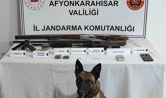 Afyonkarahisar'da uyuşturucu sattığı iddia edilen şahsın adresine baskın düzenleyen jandarma ekipleri değişik türlerde uyuşturucu maddeler ile ruhsatsız silahlar ele geçirdi.Afyonkarahisar İl Jandarma Komutanlığı ekipleri M.T. isimli şahsın Sinanpaşa ilçesine bağlı Küçükhüyük beldesinde uyuşturucu satışı yaptığı yönünde bilgi aldı. Ardından harekete geçen şahıslar şüphelinin evine baskın düzenledi. Baskında arama yapan ekipler 10 gram esrar, 20 içimlik bonzai emdirilmiş peçete, 1 gram metamfetamin, 1 gram kenevir tohumu, hassas terazi, 3 adet ruhsatsız av tüfeği ve kurusıkı tabanca ele geçirdi.Operasyon sonrası şahsın gözaltına alındığı bildirildi.