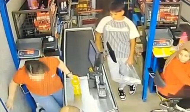 Bursa'nın Mustafakemalpaşa ilçesindeki BİM markette tartıştığı kasiyer kadına yumruk atan kişi tutuklandı.Olay, Mustafakemalpaşa ilçesi Tahıl Meydanı'nda bulunan BİM markette meydana geldi. Edinilen bilgiye göre, marketten su aldıktan sonra kasaya gelen Vedat K., kasiyer olarak görev yapan Kübra A. (31) ile tartışmaya başladı. Para sebebiyle tartıştıkları iddia edilen 2 kişiden kasiyerin müşteriye para üstünü fırlatınca tartışma daha da büyüdü. Aldığı parayı kasiyere geri fırlatan Vedat K., yere düşen parayı eğilip almak istedi. Bu sırada Kübra A. da, müşterinin eğildiği yerdeki sepete tekme atması ortalığı daha da kızıştırdı. Kasiyerin üzerine yürüyen Vedat K.'yı, marketteki diğer müşteriler uzaklaştırdı.Sözlü tartışmanın devam etmesi üzerine dışarı çıkarılan Vedat K., kapının önünde kendini içeri almayan kasiyer Kübra A.'ya yumruk attı. Aldığı darbe sonucu burnu kırılan genç kız, Vedat K.'dan şikayetçi oldu.Şüpheli, Asayiş Büro Amirliği, Karacabey İlçe Emniyet Müdürlüğü ekipleri tarafından gözaltına alındı.Yaşanan o anlar ise saniye saniye güvenlik kameralarına yansırken, mahkemeye çıkarılan Vedat K., tutuklandı.