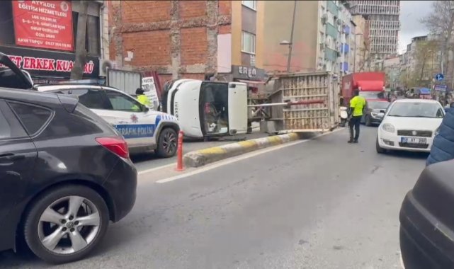 Kağıthane'de sürücüsünün inşaat demiri indirmek için damperini kaldırdığı kamyon yan yattı. Kazada maddi hasarla atlatıldı.