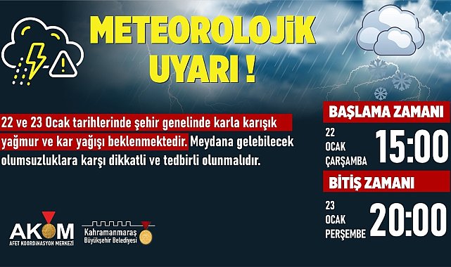 Kahramanmaraş'ta 22 ve 23 Ocak tarihlerinde şehir genelinde etkili olması beklenen karla karışık yağmur ve kar yağışına karşı dikkatli ve tedbirli olunması noktasında vatandaşlar uyarıldı.