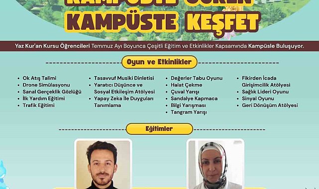 Sakarya Üniversitesi Sağlık Kültür ve Spor Daire Başkanlığı Kültür Şube Müdürlüğü ile İlahiyat Fakültesi ortaklığında hayata geçirilen "Kampüste Öğren Kampüste Keşfet" Projesi başlıyor.Proje çerçevesinde, 7 Temmuz-31 Temmuz tarihlerinde Sakarya'da eğitim gören Yaz Kur'an Kursu öğrencilerine yönelik çeşitli etkinlikler düzenlenecek. Her hafta çarşamba günleri 10.00-12.00 saatlerinde gerçekleştirilecek etkinlikler, kampüs içerisinde yer alan eski SAÜSEM binası arkasındaki yeşil alan ve Genç Ofis'te yapılacak. Çocukların kampüsü eğlenerek keşfetmelerini ve öğrenme süreçlerini keyifli hale getirmeyi amaçlayan proje kapsamında; ok atış talimi, geleneksel oyunlar, düşünce ve sosyal etkileşim atölyeleri, ilk yardım eğitimi ve girişimcilik atölyesi gibi birçok eğitici ve eğlenceli etkinlik yer alıyor. Programda ayrıca, alanında uzman akademisyenler tarafından mahremiyet ve bağımlılık temalı bilgilendirici sunumlar gerçekleştirilecek. Kültür Şube Müdürlüğü ve İlahiyat Fakültesi iş birliğinde yürütülen projeye; Sakarya Teknokent, Füzyon Kuluçka Merkezi, Öğrenci Toplulukları, Sağlık Bilimleri Fakültesi ile İnsan ve Toplum Bilimleri Fakültesi Psikoloji Bölümü de paydaş olarak katkı sağlıyor.