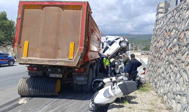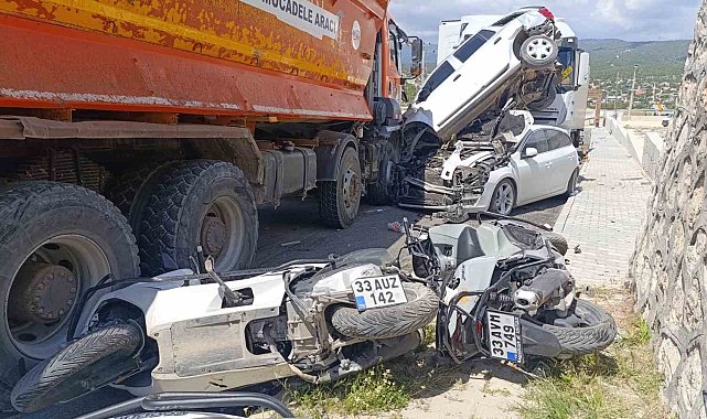 Mersin'in Silifke ilçesinde sürücüsünün direksiyon hakimiyetini kaybettiği kamyon, işçilerin park ettiği 13 motosiklete vurup, 2 otomobil ile bir tıra çarptı. Ucuz atlatılan kazada sürücü dahil kimse yaralanmadı.Kaza, ilçeye bağlı Tosmurlu Mahallesi'nde yer alan Silifke OSB girişinde meydana geldi. Alınan bilgiye göre, U.S. idaresindeki karayollarına ait 33 AEL 92 plakalı kamyon, sürücüsünün direksiyon hakimiyetini kaybetmesi sonucu yoldan çıktı. Yoldan çıkan kamyon, bir balık işleme tesisinde çalışan işçilere ait park halindeki 13 motosiklete vurup önüne iki otomobili aldı. Kamyonun sürüklediği otomobil, diğer bir otomobilin üzerine çıktı. Kamyon, otomobillerin tırla arasında sıkışmasıyla durdu. Kazada sürücü dahil kimse yaralanmadı.Olay yerine gelen polis ekipleri kaza ile ilgili inceleme başlattı.