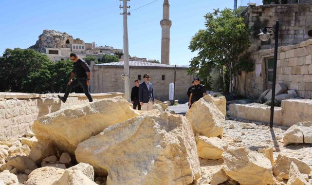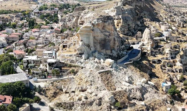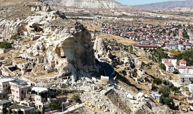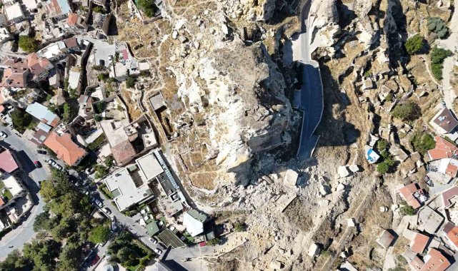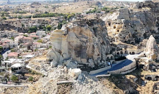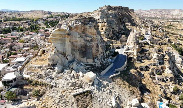UNESCO Dünya Doğal ve Kültürel Miras Listesi'nde yer alan Kapadokya bölgesinde, dün yaşanan peribacasının yıkılmasından sonra bugün de Ürgüp ilçesindeki Kadıkalesi'nin ön kısmında bulunan büyük bir kaya kütlesi koparak düştü. Bölgedeki evler ve otel tahliye edilirken düşme anı çevrede bulunan bir iş yerinin güvenlik kamerasına saniye saniye yansıdı.Kaymakamın talimatıyla boşaltıldıDün akşam saatlerinde bölgede inceleme yapan Ürgüp Kaymakamı Ömer Coşkun, Kadıkalesi'nde bulunan kaya kütlesinin düşmek üzere olduğunu fark ederek, bölgenin boşaltılması talimatını verdi. Talimat üzerine bölgede bulunan 3 ev ve bir otelde konaklayan toplam 19 kişi tahliye edildi.Gece saatlerinde büyük bir gürültü ile kopan kaya parçaları çevreye saçıldı. Bölgede bulunan evlere kadar gelen devasa kaya kütleleri hiçbir can ve mal kaybına neden olmadı.Devasa kaya kütlelerinin düştüğü anlar da çevrede bulunan bir iş yerinin güvenlik kamerasınca saniye saniye kaydedildi.Olay sonrası alanda incelemelerde bulunan Ürgüp Kaymakamı Ömer Coşkun, yaptığı yazılı açıklamada şunları kaydetti:"20 Eylül 2025 günü Ürgüp ilçemizin Kadıkalesi mevkiinde yaptığımız incelemelerde ciddi bir risk tespit ettik. Hiç vakit kaybetmeden gerekli talimatları vererek bölgedeki evlerin acilen boşaltılmasını sağladık. Bugün gece saat 01.58'de ana kayadan kopan parçalar ciddi bir yıkıma yol açtı. Ama çok şükür ki, aldığımız hızlı tedbirler sayesinde tek bir vatandaşımızın burnu bile kanamadı. Eğer o evler boşaltılmamış olsaydı, bugün büyük bir felaketle karşı karşıya kalabilirdik. Bu olay bize bir kez daha gösterdi ki, doğal afetlere karşı tedbir almak, riskleri önceden görmek ve hızlı hareket etmek hayat kurtarıyor. Olayın gerçekleştiği anda AFAD, Emniyet ve İtfaiye ekiplerimiz bölgeye sevk edilerek güvenlik sağlandı. Ayrıca riskin devam etmesi nedeniyle ana kayanın hemen yakınında bulunan evlerde yaşayan vatandaşlarımızı ve bir oteldeki misafirlerimizi de güvenli bir şekilde başka otellere yerleştirdik. AFAD İl Müdürlüğü'müz ve Kapadokya Alan Başkanlığı tarafından hazırlanacak rapor doğrultusunda bundan sonraki süreçteki riskleri değerlendirip tedbirlerimizi ona göre alacağız."