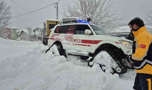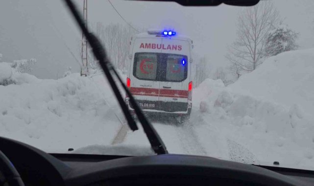 Bartın'da il merkezine yaklaşık 70 kilometre uzaklıktaki köyde yaşayan ve nefes darlığı rahatsızlığı bulunan 76 yaşındaki Mevlüt Işık'ın imdadına sağlık ekipleri yetişti. Paletli ambulansla yaklaşık 2 buçuk saat süren zorlu yolculuğunun ardından ulaşılan Mevlüt Işık, yapılan ilk müdahalenin ardından hastaneye yetiştirildi.Bartın'ın Ulus ilçesine bağlı Yukarıdere köyünde yaşayan 76 yaşındaki Mevlüt Işık'ın öğlen saatlerinde rahatsızlanması sonucu yakınları 112'yi arayarak yardım istedi. Nefes darlığı ve kronik akciğer rahatsızlığı bulunduğu belirtilen Mevlüt Işığa ilk müdahale için en yakın istasyondan ambulans yönlendirildi. Bartın Sağlık Müdürlüğü Acil Sağlık Hizmetleri ambulansı, yolda 25 santimetreyi aşan kar, tipi ve buzlanma gibi nedenlerden hastaya ulaşamadı. Bunun üzerine bölgeye İl Özel İdaresi'ne ait iş makineleri yönlendirilirken, saat 14:30 sıralarında bölgeye paletli ambulans yönlendirildi. Çekici üstüne yüklenen paletli ambulans, yolun kar bulunmayan yaklaşık 45 kilometrelik kısmını çekici üstünde gitti. Karlı yolda çekicinin dorsesinden indirilen paletli ambulans, yaklaşık 25 kilometrelik zorlu yolculuğa başladı. Sağlık ekipleri, karla mücadele ekiplerinin kısmi olarak açabildiği yolda ilerleyen paletli ambulans, önüne çıkan ve kayan araçlar, yolda yükselen kar tabakası, buzlanma, karla kaplı ağaç dallarının yola doğru eğilmesi gibi zorlu kış şartlarına rağmen yoluna devam etti. Hiç açılmamış ve yüksekliği 120 santimetreyi aşan yolu da geçerek hastanın bulunduğu konuma giden ekipler, hastaya ulaşmayı başardı.Ekipler, kısa bir yürüyüşün ardından evde bekleyen Mevlüt Işık'ı alarak, paletli ambulansa aldı. Yapılan ilk tedavi ve müdahalenin ardından Mevlüt Işık, paletli ambulansla normal ambulansın bulunduğu bölgeye getirdi. Yaklaşık 2.5 saatte ulaşılan hasta, ambulansla hastaneye yetiştirildi.Hastane acilinde yapılan müdahalenin ardından tedavisine başlanan Işık'ın sağlık durumunun iyi olduğu öğrenildi.