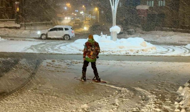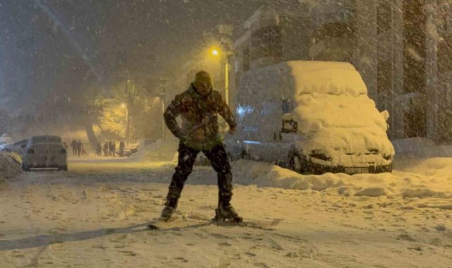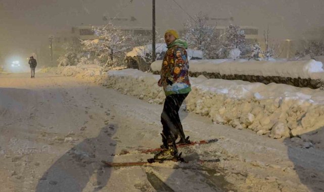 Karabük'te etkili olan kar yağışını fırsata çeviren bir içerik üreticisi, kayak takımlarıyla Safranbolu'nun tarihi sokaklarında kayarak renkli görüntülere imza attı.Karabük genelinde kar yağışı etkisini sürdürmeye devam ediyor. Yollar karla kaplanırken, sürücüler de ilerlemekte güçlük çekti. Bazı araçlar rampaları çıkamayarak geri dönüş yaptı. Yaşamı olumsuz etkileyen kar yağışı renkli görüntüleri de ortaya çıkardı. UNESCO Dünya Mirası Listesi'nde yer alan Safranbolu'da bir içerik üreticisi, kayak takımlarını giyerek sokaklarda kayak yaptı.Karın keyfini doyasıya çıkaran içerik üreticisi Furkan Gülçetiner, gazetecilere yaptığı açıklamada, "Kar yağışı herkesi olduğu gibi bizi de heyecanlandırdı. Bende kayak takımlarımı alarak bir farkındalık ve deneyim olsun diye trafiğin olmadığı sokaklarda kaymak istedim. Çok güzel bir deneyimdi" ifadelerine yer verdi. Kayak sporunun çok güzel olduğunu ifade eden Gülçetiner, herkesin bu sporla ilgilenmesi tavsiyesinde bulundu.Minibüs şoförü Hayati Özbek, yolların çok kötü durumda olduğunu aktararak, "Sabah ne yapacağız bilmiyoruz" dedi. Özbek, yaşadıkları olumsuzluklara rağmen kar yağışının da kış güzelliği olduğunu dile getirdi.Öte yandan Safranbolu'nun bir çok noktasında vatandaşlar ve çocuklar, mahalle aralarını kayak merkezine çevirdi. Poşetlerini ve kızaklarını alan çocuklar, kayarak doyasıya karın tadını çıkardı. Kayak merkezine gidemediklerini belirten çocuklar, kendi kayak merkezlerini oluşturduklarını aktardılar.