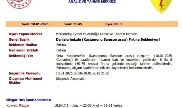 SAMSUN (İHA) – Meteoroloji Genel Müdürlüğü (MGM), Ora Karadeniz'de hızı saatte 75 kilometreye ulaşan fırtına uyarısında bulundu.MGM, Analiz ve Tahmin Merkezi, Kastamonu-Samsun arasında Orta Karadeniz'de fırtına uyarısı yaptı. Fırtına hakkında yapılan açıklamada, "Orta Karadeniz'de (Kastamonu-Samsun arası) rüzgarın günün ilk saatlerinden itibaren batı ve kuzeybatı yönlerinden 6-8 kuvvetinde (50-75 km/sa) fırtına şeklinde eseceği tahmin edilmektedir. Fırtınanın, akşam saatlerinde etkisini kaybetmesi beklenmektedir" ifadeleri yer aldı.