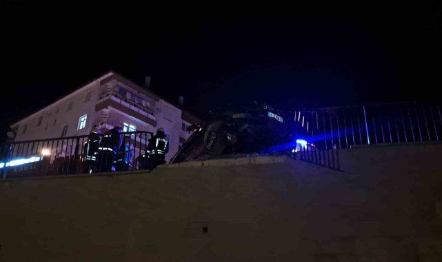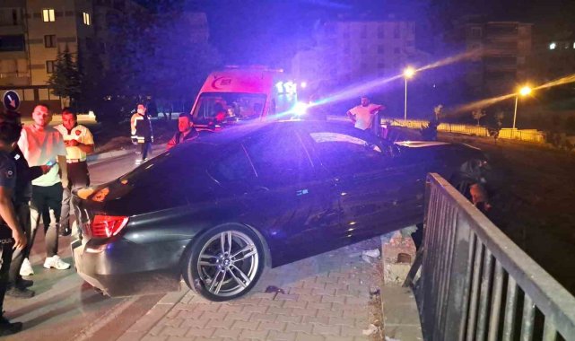 Karaman'da kontrolden çıkan otomobil demir bariyere çarparak asılı kaldı