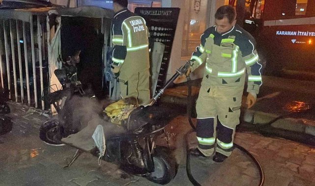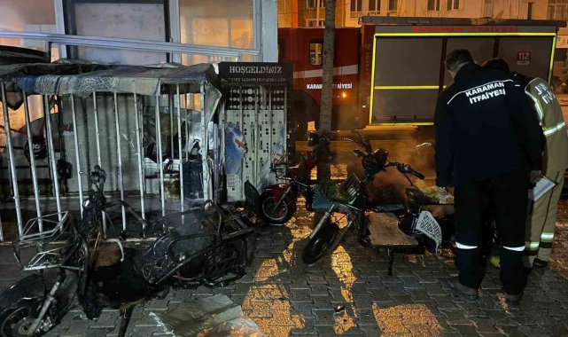 Karaman'da şarja bırakılan 3 elektrikli bisiklet yanarak kullanılamaz hale geldi.Yangın, gece saat 01.20 sıralarında Yenimahalle Zeytin Dalı Bulvarı yakınlarında bir iş yerinin önünde meydana geldi. Edinilen bilgiye göre, şarjda bırakılan demir kafes içerisindeki 3 adet elektrikli bisiklet henüz bilinmeyen bir nedenle alev aldı. Alevleri fark eden vatandaşların ihbarı üzerine olay yerine itfaiye ve polis ekipleri sevk edildi. İtfaiye ekiplerinin müdahalesiyle yangın kısa sürede söndürülerek kontrol altına alınırken, elektrikli bisikletler tamamen yanarak kullanılamaz hale geldi.Yangının çıkış nedeninin belirlenmesi için inceleme başlatıldı.