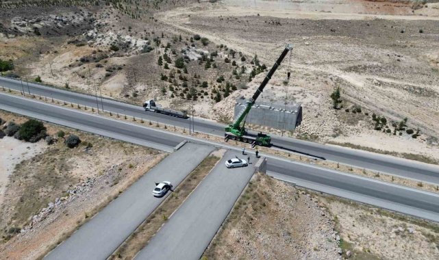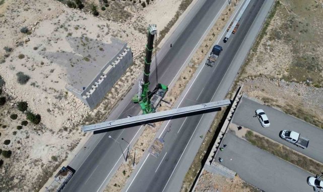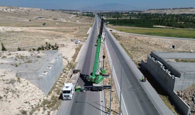 Karaman'da yeni çevre yolunun Mersin yolu girişindeki köprülü kavşağın 60 tonluk köprü kirişleri vinçle yerleştirildi. Yürütülen çalışmalar dronla görüntülendi.