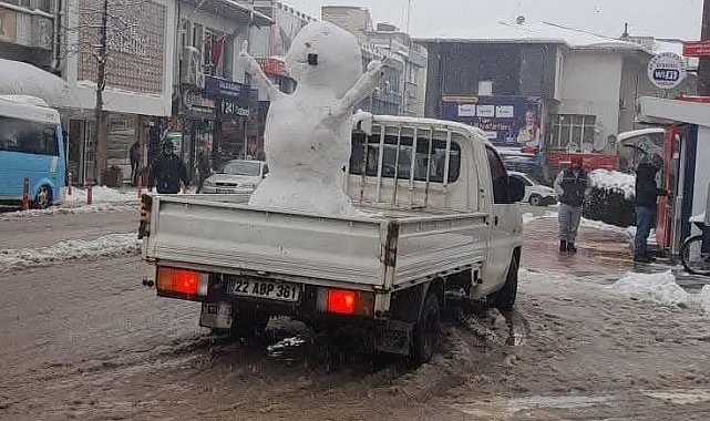 Edirne'nin Keşan ilçesinde vatandaşların kamyonetin arkasında yaptıkları kardan adama şehir turu attırdığı görüntüler sosyal medyada viral oldu.