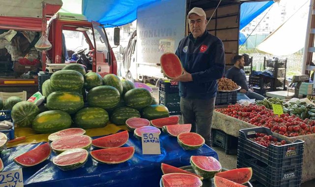 Mersin'de sezonun ilk karpuzları pazarda satışa çıkarken, dilim dilim müşteriye sunulması dikkat çekti. Kilosu 50 TL olan, çeyreği 65 ile 90 TL arasında satılan karpuza vatandaşlar rağbet gösterdi.Erdemli ilçesinde sebze ve meyve pazarında satışa çıkan karpuz dikkat çekti. Türkiye'nin turfanda üretimi ile ön planda olan bölgede dışardan getirildiği belirtilen karpuz dilim dilim satıldı. Genelde çeyrek ve yarım olarak vatandaşların rağbet gösterip aldığı karpuzun kilogram fiyatının 50 TL olduğu belirtildi. Çeyreğinin ağırlığına göre 65 ile 90 TL arasında değişen karpuzun talep görmesi pazarcı Mehmet Akça'yı da sevindirdi.Pazarcı Mehmet Akça, "Sezonun ilk karpuzunu satışa sunduk. Daha ekonomik olsun diye dilim dilim yaptık. Yarım ve çeyrek müşterilerimize sunuyoruz. Çok tatlı bir karpuz, fiyatı çok uygun. Şu anda kilogramı 50 liradan satıyoruz. Herkes de çok memnun, iyi de rağbet var" dedi.Sezonun ilk karpuzunu yediklerini belirten vatandaşlar ise karpuzun dilim dilim satıldığını belirterek sezonun ilki olmasına rağmen çok güzel olduğunu kaydetti.