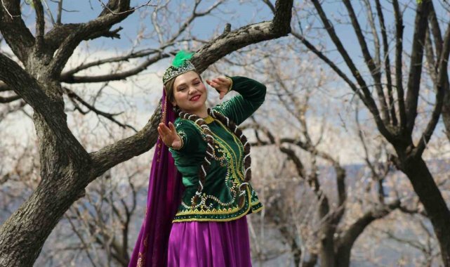 Kars'ta baharın gelişiyle doğa adeta yeniden can bulurken, ortaya çıkan manzara görenleri mest etti. Çiçek açan meyve ağaçlarıyla bezeli bağlar, bu kez yalnızca doğanın değil, sanatın da sahnesi oldu. Geleneksel Kafkas dansı yapan bir kadın, beyaz çiçeklerin arasında sergilediği zarif figürlerle görsel bir şölen sundu.
