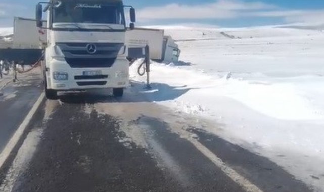 Kars'ta sürücüsünün direksiyon hakimiyetini kaybettiği tır, kayarak yolu kapattı.