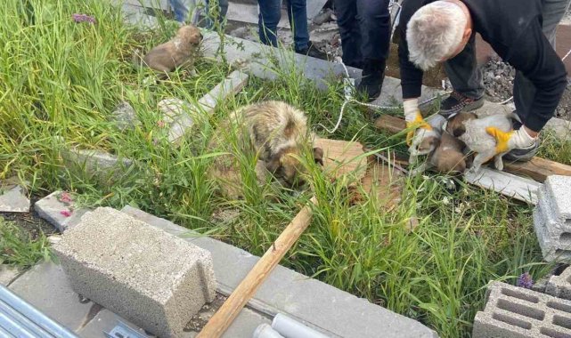 Kars'ta soba bacasına düşen yavru köpekler kurtarıldı