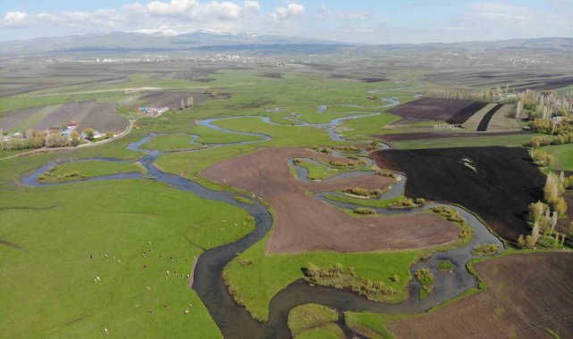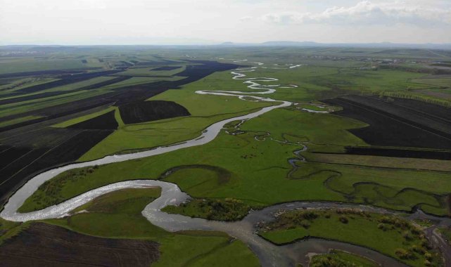 Kars'ta yeşilin tonları, meralarda otlayan hayvan sürüleri ve gökyüzünün mavisiyle birleşen Arpaçay Menderesleri görsel şölen sunuyor.